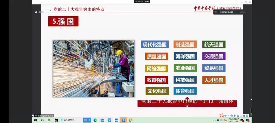 线上会议中,第十三届全国政协委员张占斌同志从党的二十大报告突出的特点、亮点、重点三个方面对二十大报告进行深入解析。张占斌同志结合实际,对党的二十大报告进行归纳总结,提出二十大报告具有旗帜、团结、创新、自信、强国、一流、安全、斗争等8个特点。此外,他还从断新标注、开辟新境界、理论新高度、认识新升华、战略新任务、实践新方略、党建新视角、政治新要求等8个方面对二十大报告进行详细和深入地解读。他提出党的二十大报告取得了许多新突破,如:进一步明确习近平新时代中国特色社会主义思想精神实质,进一步明确十年历史变革在党史、新中国史、改革开放史、社会主义发展史、中华民族发展史上的里程碑意义,进一步明确中国共产党今后的中心任务等。