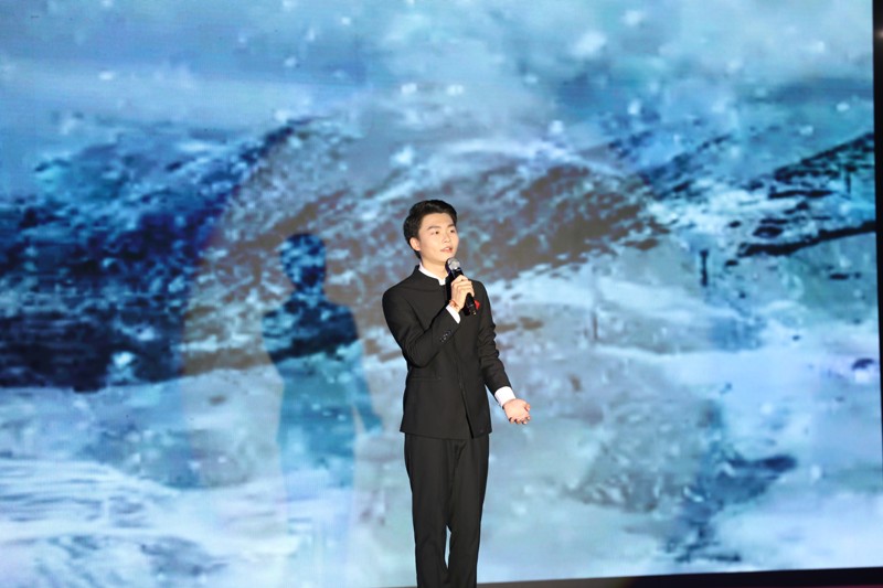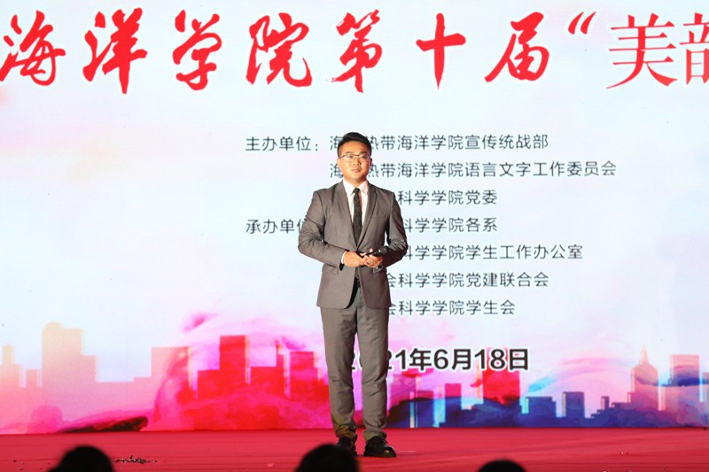 在19组选手比赛结束后,评委嘉宾--bevitor伟德2007级毕业生、海口广播电视台主持人刘永猛为我们带来兼具专业性与表演性的朗诵表演。
