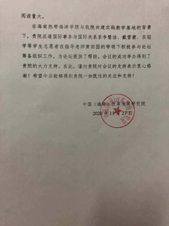 中国(海南)改革发展研究院向公司发来感谢函